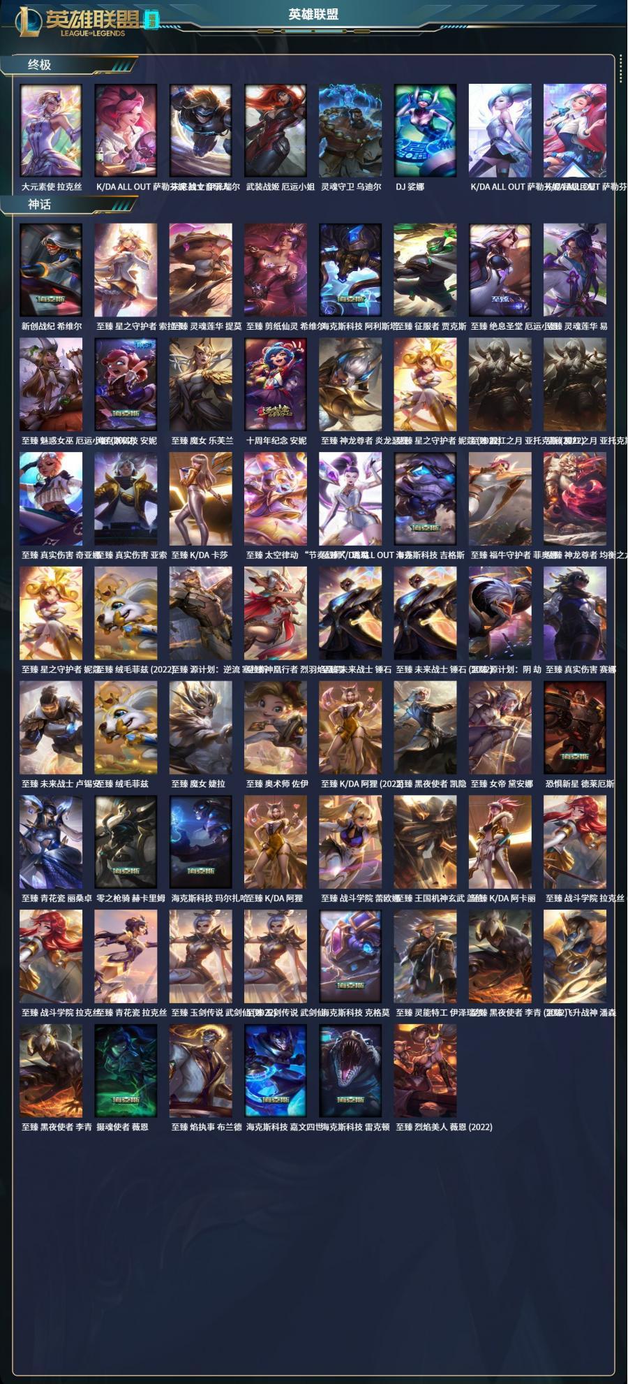 至臻K/DA卡莎,至臻黑夜使者凯隐,至臻星之守护者妮蔻(2022),至臻战斗学院拉克丝,至臻征服者贾克斯,至臻神龙尊者炎龙瑟提,至臻源计划:阴劫,至臻福牛守护者菲奥娜,至臻源计划:逆流塞拉斯,至臻黑夜使者李青(2022),至臻战斗学院拉克丝(2022),至臻青花瓷丽桑卓,至臻女帝黛安娜,至臻王国机神玄武盖伦,至臻灵魂莲华提莫,至臻神龙尊者均衡之龙沃利贝尔,至臻K/DA阿狸(2022),至臻腥红之月亚托克斯(2022),至臻未来战士锤石,至臻电玩女神凯特琳(2022),至臻K/DA伊芙琳(2022),至臻魅惑女巫厄运小姐(2022),至臻真实伤害奇亚娜,至臻焰执事布兰德,至臻源计划:正义艾瑞莉娅,至臻K/DA阿卡丽,至臻星之守护者索拉卡,至臻太空律动节奏幻师璐璐,至臻K/DA阿狸,至臻K/DAALLOUT卡莎,至臻黑夜使者李青,至臻魔女婕拉,至臻电玩女神凯特琳,至臻灵魂莲华易,至臻灵能特工伊泽瑞尔,至臻烈焰美人薇恩(2022),至臻星之守护者妮蔻,至臻神凰行者烈羽焰凰霞,至臻青花瓷拉克丝,至臻飞升战神潘森,至臻暗星墨菲特,至臻玉剑传说武剑仙(2022),至臻魅惑女巫莫甘娜,至臻剪纸仙灵希维尔,至臻绝息圣堂厄运小姐,至臻未来战士锤石(2022),至臻花仙使者卡特琳娜,至臻未来战士卢锡安,至臻绒毛菲兹,至臻魔女乐芙兰,至臻战斗学院蕾欧娜,至臻魅惑女巫厄运小姐,至臻真实伤害赛娜,至臻源计划:正义艾瑞莉娅(2022),至臻真实伤害亚索,至臻烈焰美人薇恩,至臻绒毛菲兹(2022),至臻玉剑传说武剑仙,至臻腥红之月亚托克斯,至臻奥术师佐伊,至臻K/DA伊芙琳