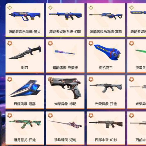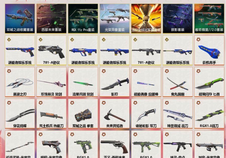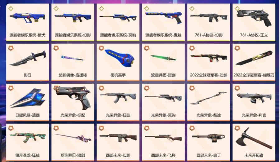 流星兵团-短剑,未来开拓者,RGX-11z-Pro-战刀,2022全球冠军赛-蝴蝶刀,诡秘蛇影-军刀,珍珠棘贝-短剑,光荣异象-歧途,黑波之刃,鬼丸国纲,影刃,双城之战-拳套,穿花蝴蝶,街机高手